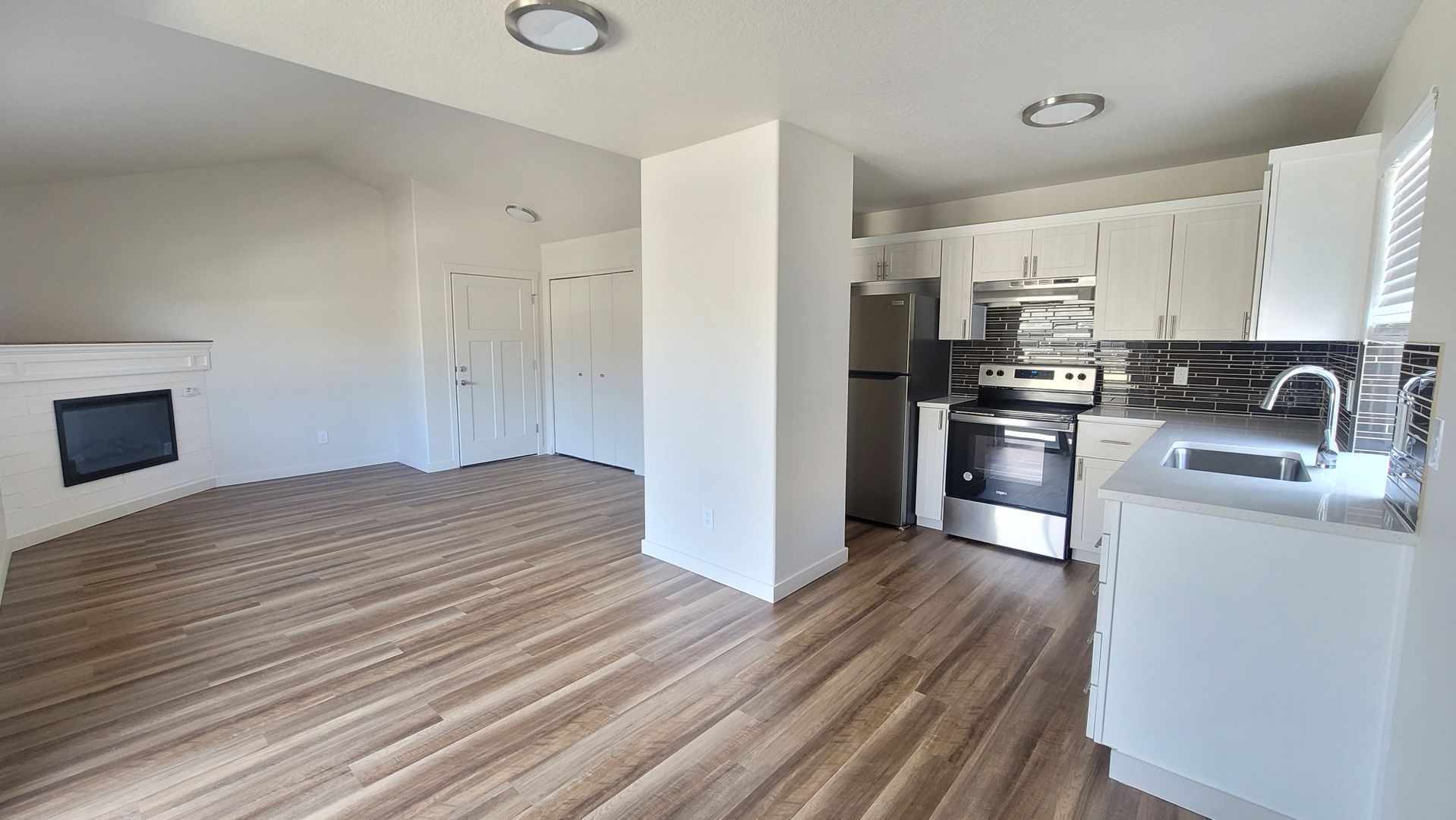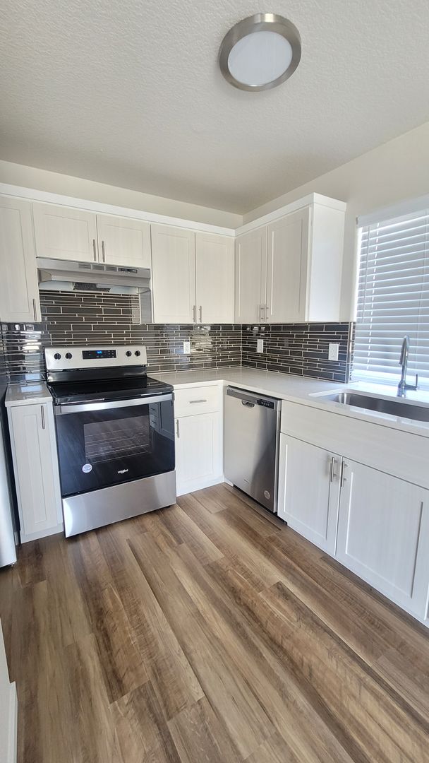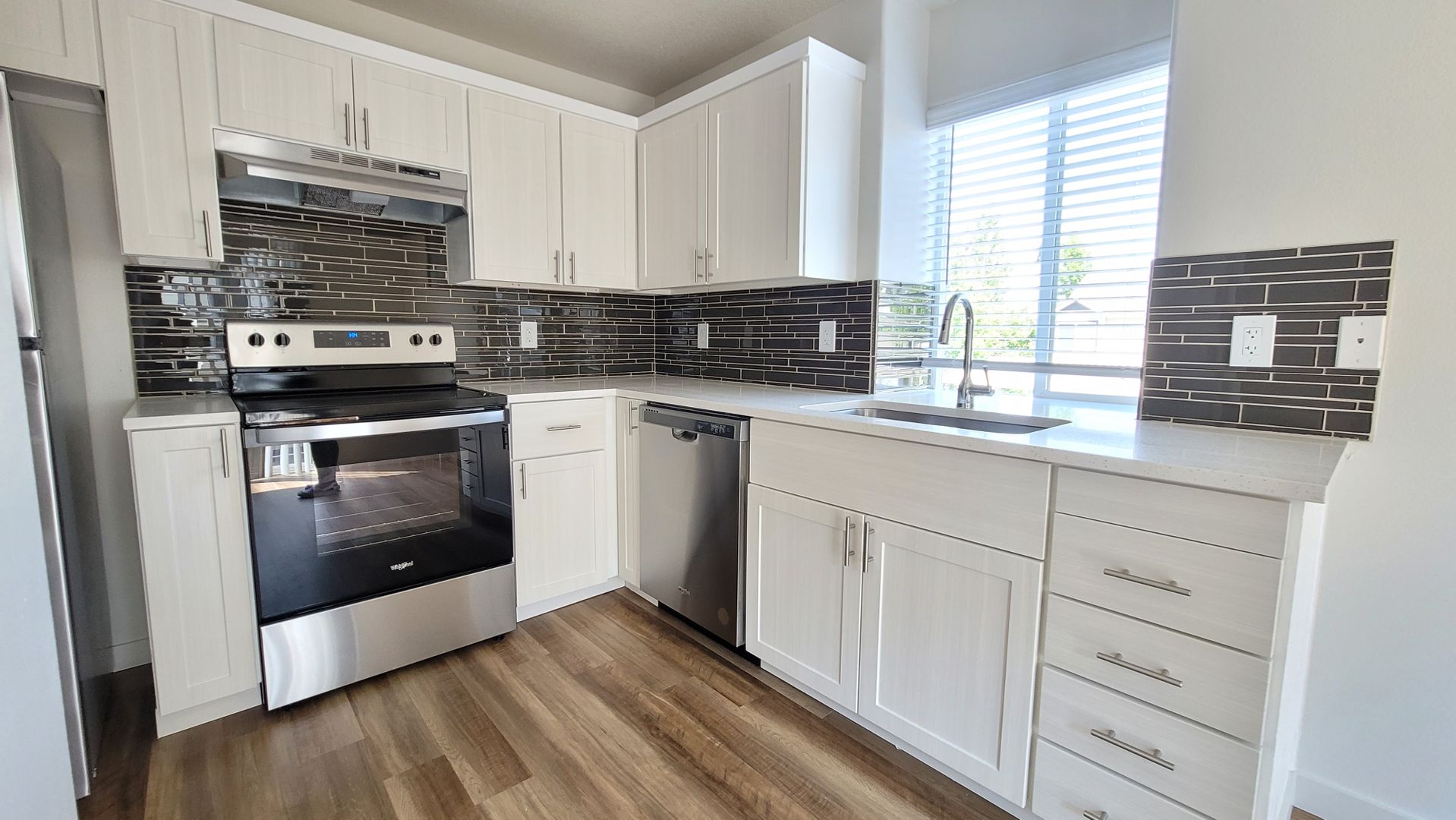 Enjoy a spacious open-concept layout featuring designer two-tone color schemes, luxury vinyl flooring, and plush carpeted bedrooms. The kitchen showcases quartz countertops, elegant tile backsplashes, stainless steel appliances (including a built-in microwave), and upscale lighting—perfect for both everyday living and entertaining.
